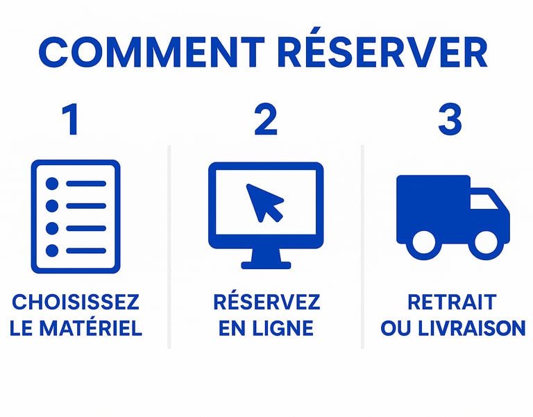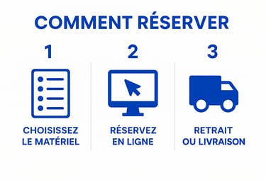 Pour récupérer le matériel, il vous suffit de faire une demande de réservation en ligne ou de nous contacter par téléphone. Nous préparerons alors votre commande pour qu’elle soit prête lors de votre passage.